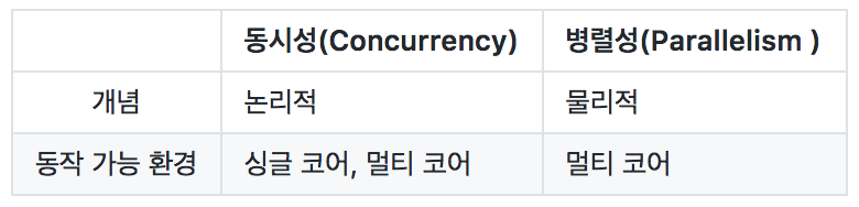 -> 동시성은 싱글코어 및 멀티코어에서 모두 구현할 수 있지만, 병렬성은 멀티 코어에서만 구현 가능