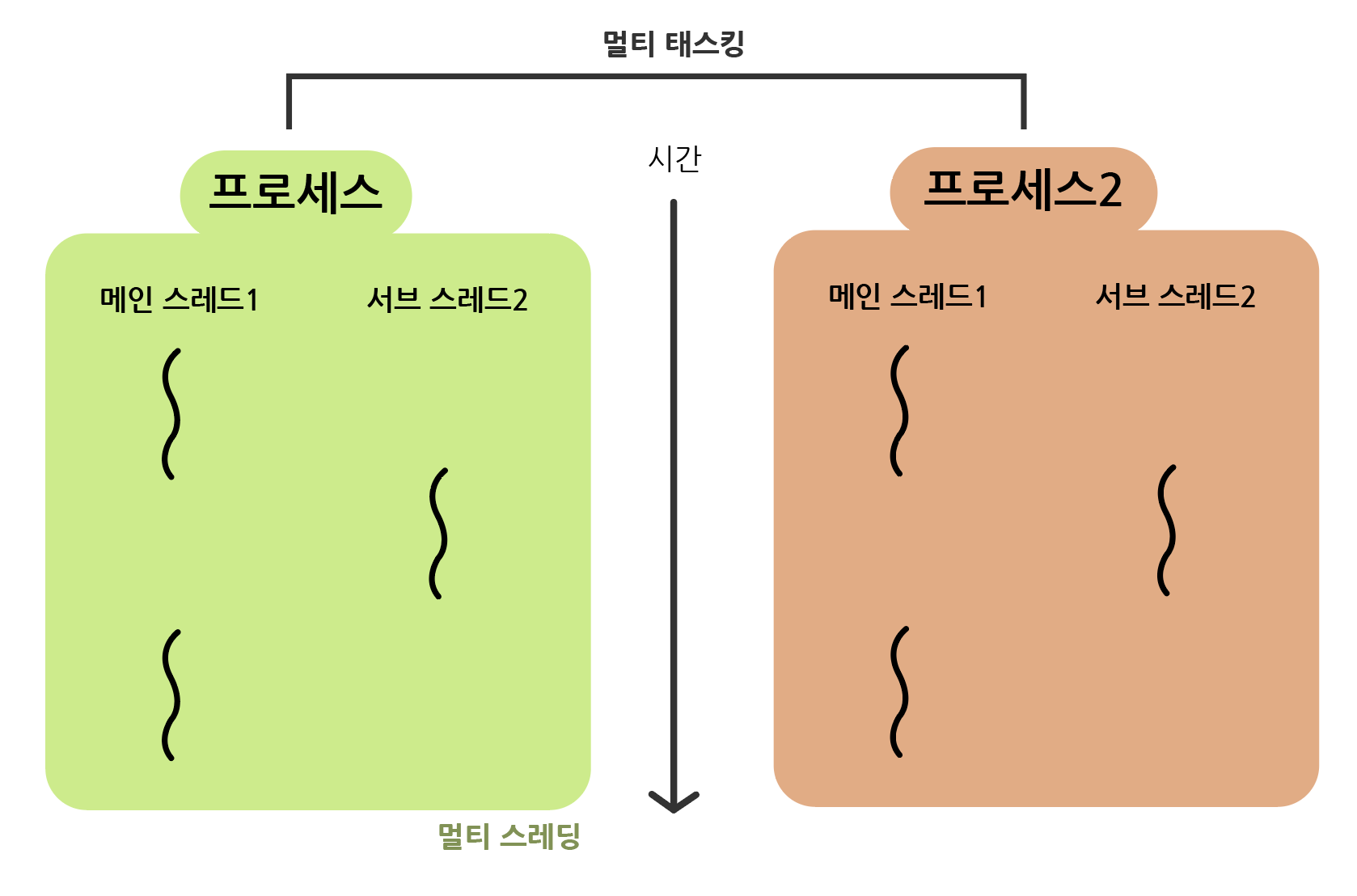 - 스레드 : 하나의 프로세스 내에서 실행되는 작업흐름의 단위. 보통 한 프로세스는 하나의 스레드를 갖고 있지만 프로세스에 따라 둘 이상의 프로세스를 동시에 실행할 수도 있음(멀티 스레딩).