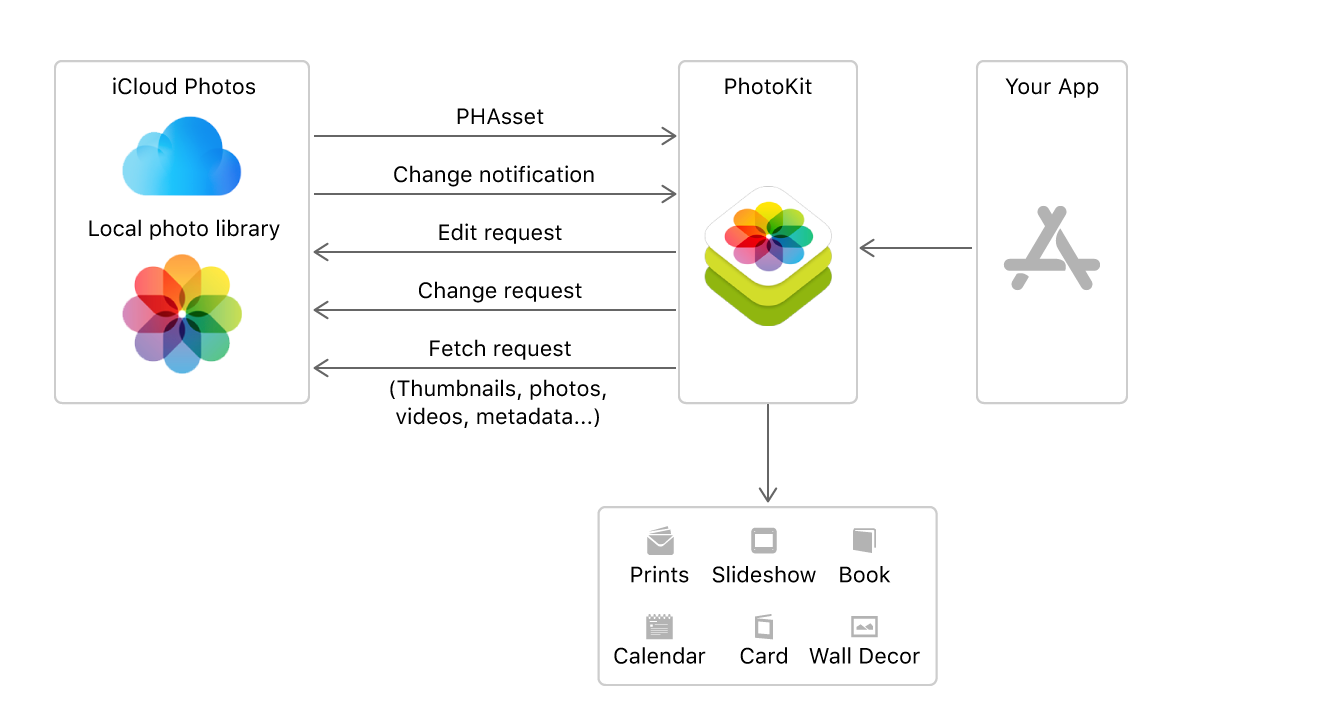 - iOS와 macOS에서 PhotoKit은 Photos 앱을 위해 사진 편집 확장 기능을 지원하는 클래스를 제공하고, 앱을 통해 다뤄지는 사진과 비디오에 직접 접근을 제공한다.
