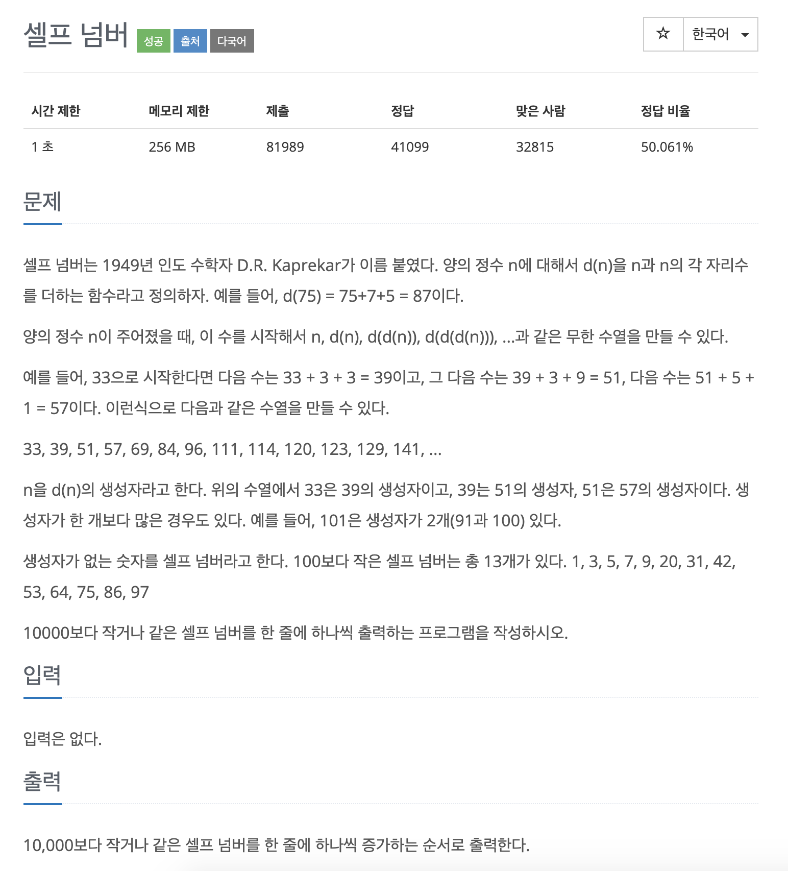 암튼 숫자를 1(생성자)부터 넣어서 돌리고 나온 숫자를 모으면 셀프넘버가 아닌 수가 모이고,